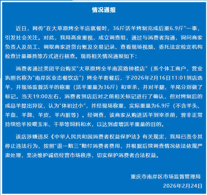 近日,网传“在大草原烤全羊店就餐时,36斤活羊烤制完成后重6.9斤”一事,引发社会关注。对此,我局高度重视,成立调查组,通过与消费者沟通、询问商家负责人及员工、调取商家进货台账及交易记录、查看现场视频、委托法定检定机构检查计量器具等方式进行核查。现将相关情况通报如下: